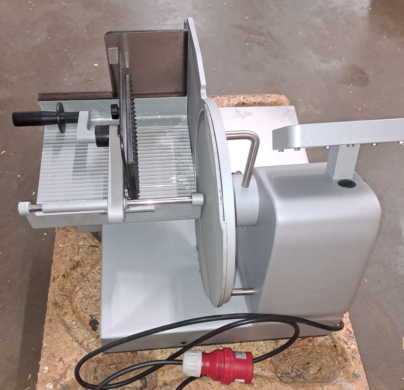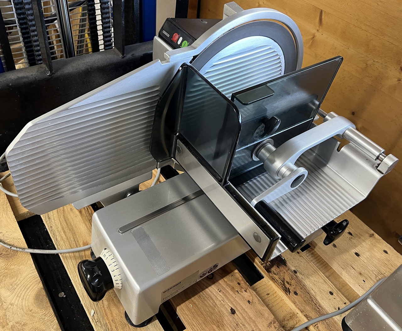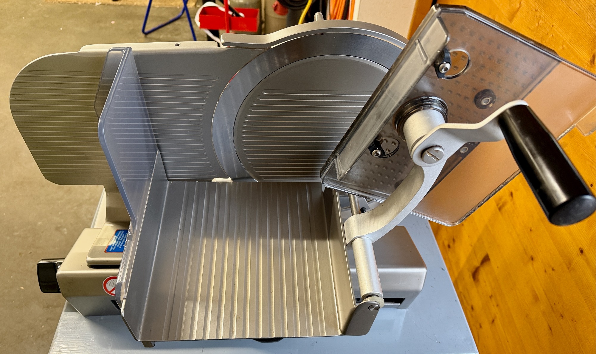 durch das Schwungrad werden automatisch Messer, Schlitten und Vorschub angetrieben, ein Blickfang für Kunden. Gewicht ca. 123kg,