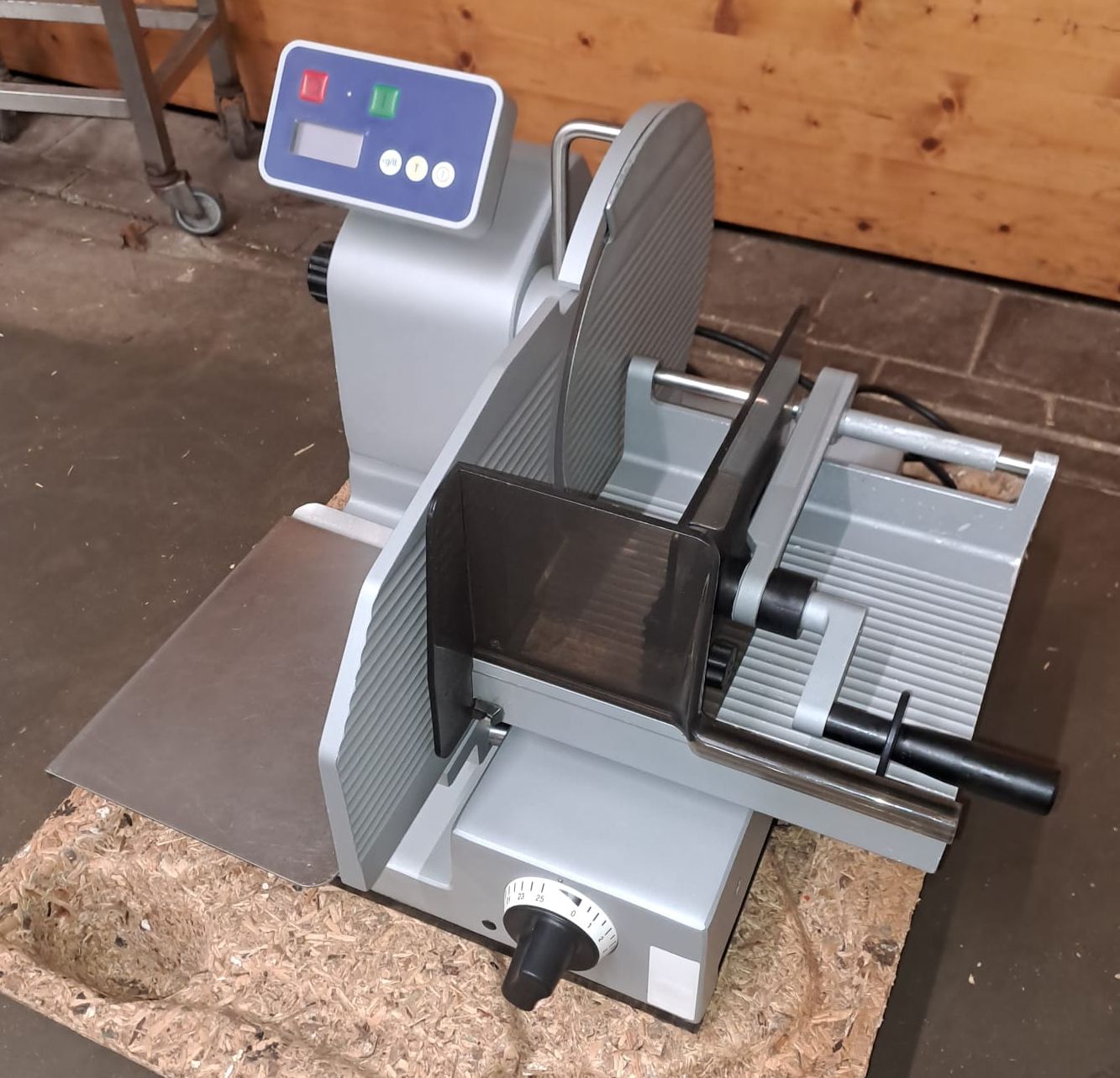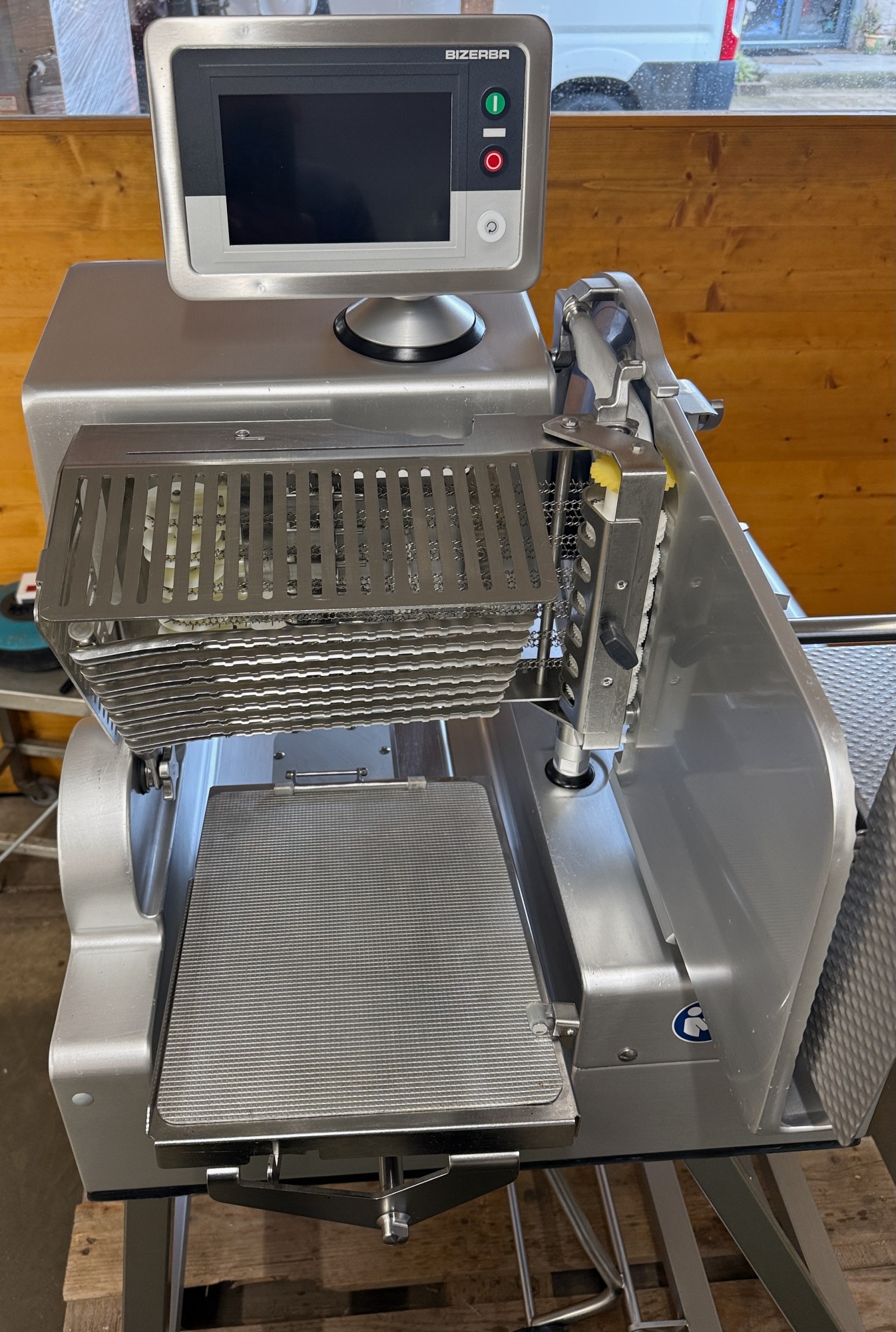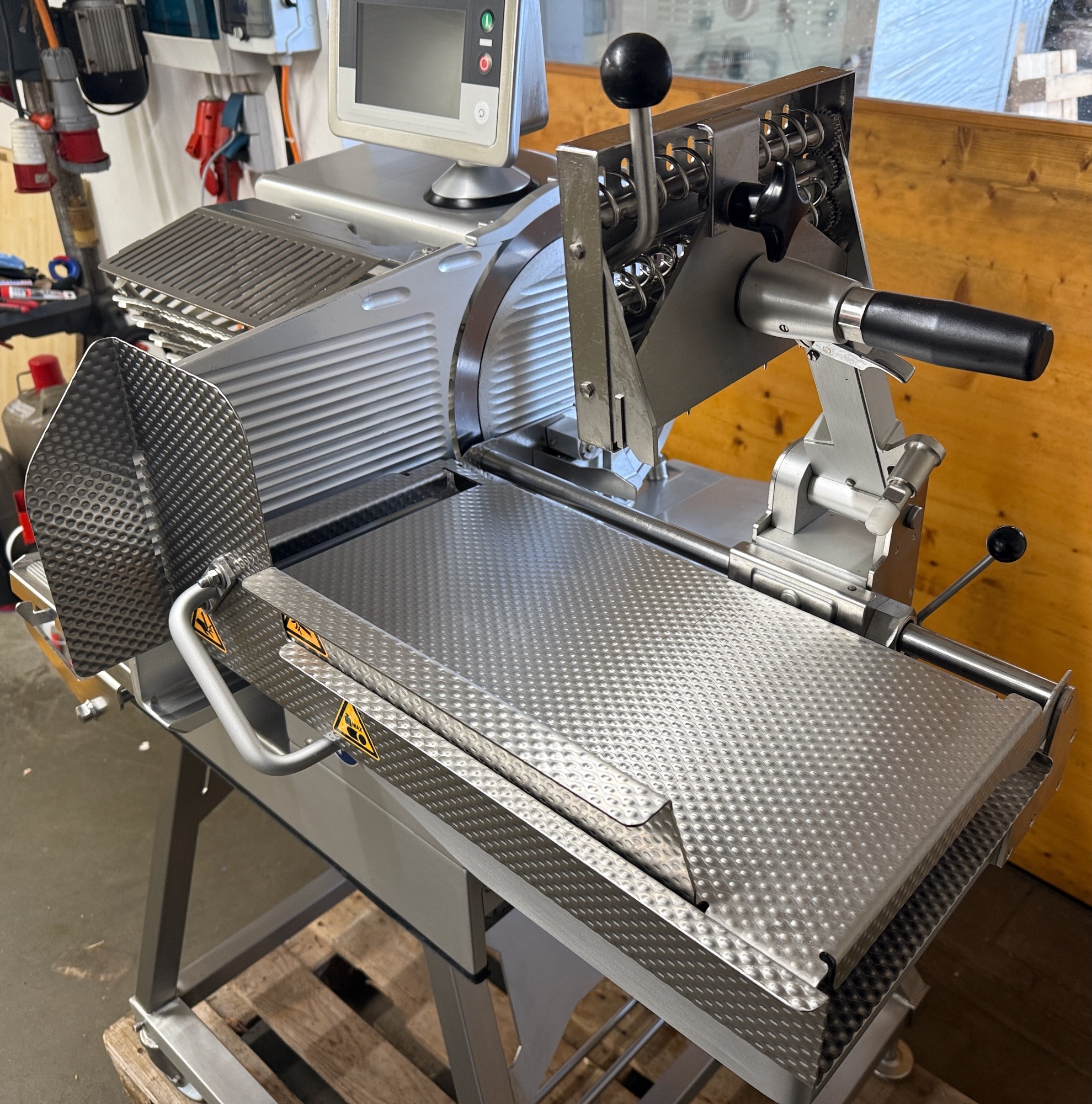 durch das Schwungrad werden automatisch Messer, Schlitten und Vorschub angetrieben, ein Blickfang für Kunden. Gewicht ca. 123kg,
